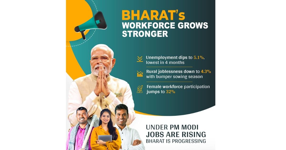 Under the leadership of PM Narendra Modi, Bharat’s job market is witnessing remarkable progress. Unemployment has dipped to 5.1%, the lowest in 4 months. Rural joblessness has fallen to 4.3%, supported by a bumper sowing season. Female workforce participation has surged to 32%, reflecting greater inclusivity and empowerment. A growing workforce means a stronger economy. From villages to cities, every sector is contributing to Bharat’s rise as a global powerhouse. Under PM Modi, jobs are rising, Bharat is progressing.