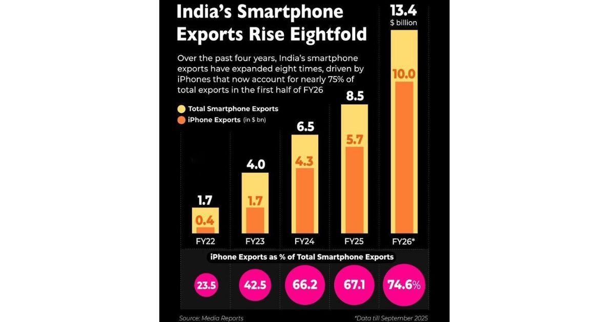 From $1.7 billion in FY22 to $13.4 billion in FY26 — in just four years, India’s smartphone exports have grown eightfold, marking a historic leap in the nation’s manufacturing strength. Key Transformations Since 2014: Rapidly developing electronics manufacturing ecosystem. Global giants are establishing export hubs in India. iPhones now account for nearly 75% of total smartphone exports $10 billion worth of iPhones were exported in just the first half of FY26. India is no longer just consuming technology — we’re building it for the world.